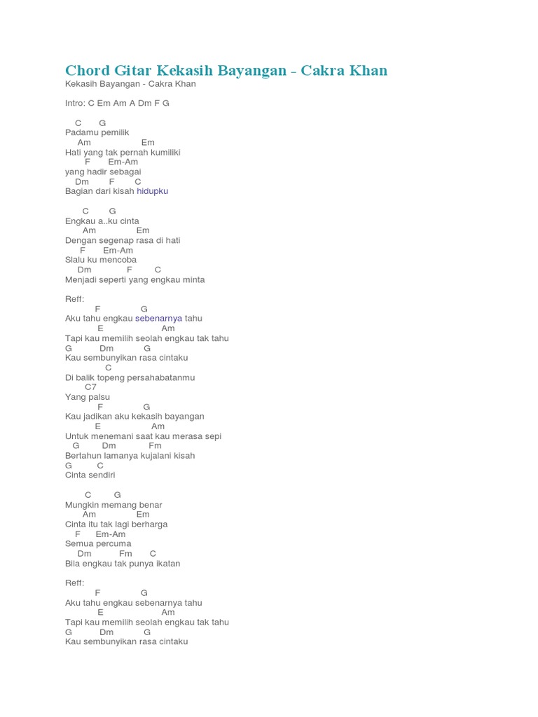 E Am tapi kau memilih seolah engkau tak tahu - G Dm G kau sembunyikan. Cakra Khan Kekasih Bayangan Chord intro C GB A A Dm G C G Padamu pemilik Am Em hati yang tak pernah ku miliki F Em Am Yang hadir sebagai Dm F C G bagian dari kisah hidupku C G Engkau aku cinta Am Em dengan segenap rasa di hati F Em Am Selalu ku mencoba Dm F C menjadi seperti yang engkau minta chorus F G Aku tahu engkau sebenarnya tahu E Am Tapi kau memilih seolah engkau. Mudah-mudahan dengan memainkan lagu KEKASIH BAYANGAN - CAKRA KHAN ini dapat menghiburmu dan jangan lupa mainkan juga chord lagu lainnya yang dinyanyikan oleh Cakra Khan.